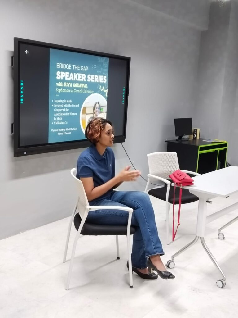 for the second bridge the gap speaker series we called our alumni Riya Agarwal an incoming sophomore at Cornell University, majoring in math. She shared her views and experiences in the field of math and also talked about the stem gap, and students asked her questions regarding the same.
